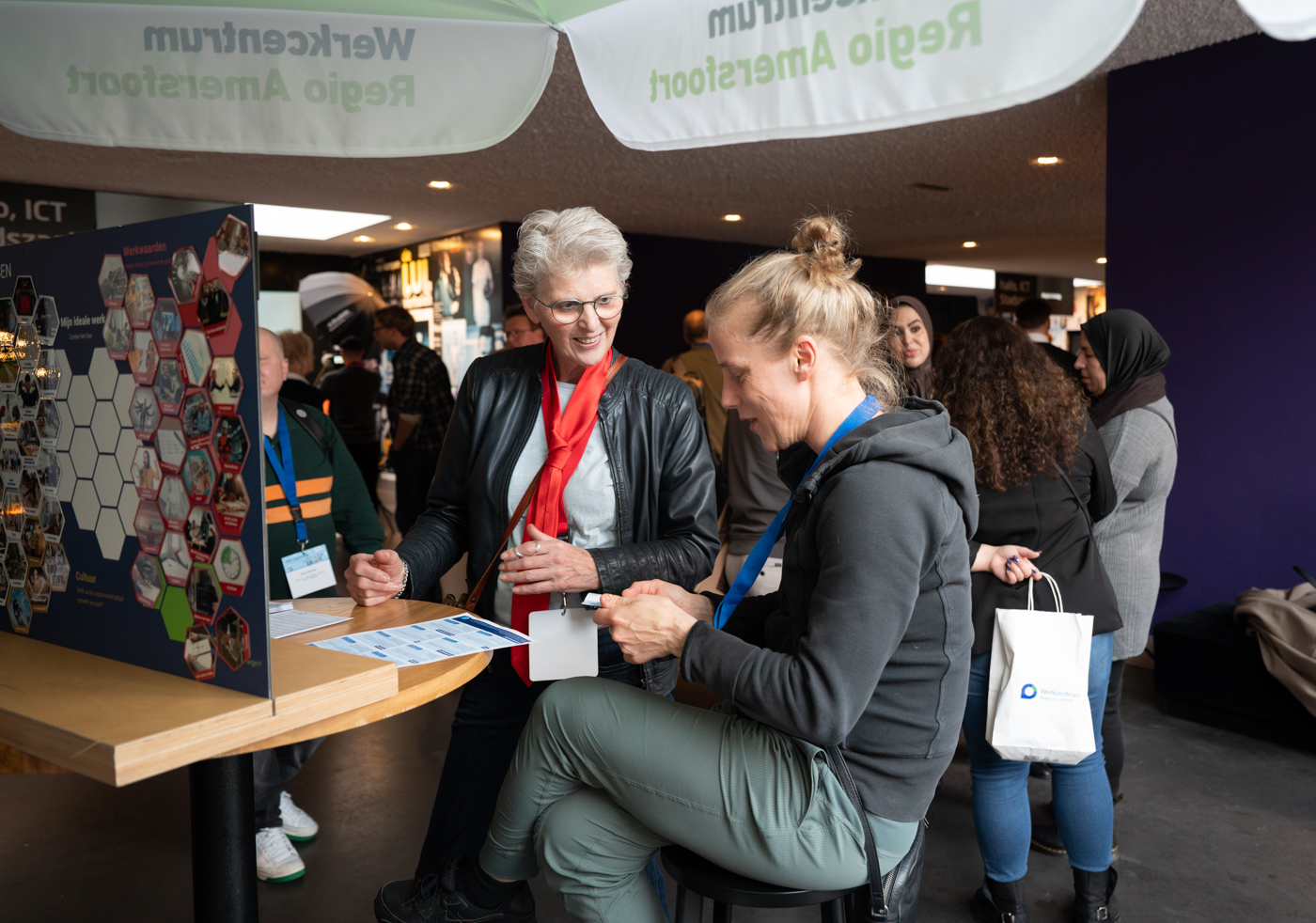 Ruim 90 werkgevers en 175 werkzoekenden kwamen binnen tijdens de inlooplunch, waarbij zij op het netwerkplein met elkaar in gesprek konden gaan, maar ook veel konden doen. Zo kon iedereen naar de kapper, visagiste of Dress for Success voor kleuradvies en daarna een professionele LinkedIn foto laten maken.